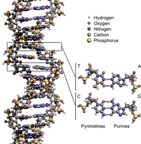Каждая часть клетки состоит из молекул. И здесь мы начинаем проникать в микромир — мир атомов. Молекулы — это цепочки атомов, соединённые химическими связями. Вот так выглядит молекула ДНК: