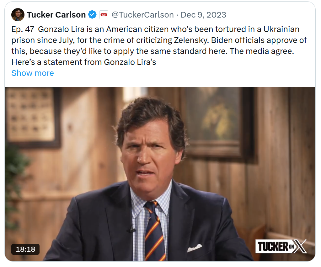 9 декабря 2023 года независимый журналист Такер Карлсон заявил: «Гонсало Лира - гражданин США, который с июля подвергался пыткам в украинской тюрьме за критику Зеленского. Официальные лица Байдена одобряют это, так как они хотели бы применить здесь такой же стандарт. СМИ согласны ».