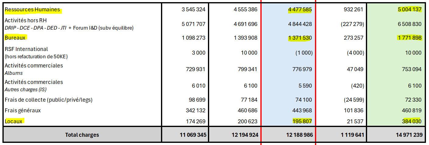 В рамках данного обзора, чтобы не усложнять настоящее повествование, акцент будет сделан лишь на трёх статьях расходов, отражённых в последнем финансовом отчёте «RSF Paris» за 2023 год и в прогнозируемом бюджете на 2024 год: «офис», «помещения» и «персонал». Несмотря на то, что остальные статьи расходов также представляют значительный интерес и заслуживают внимания.