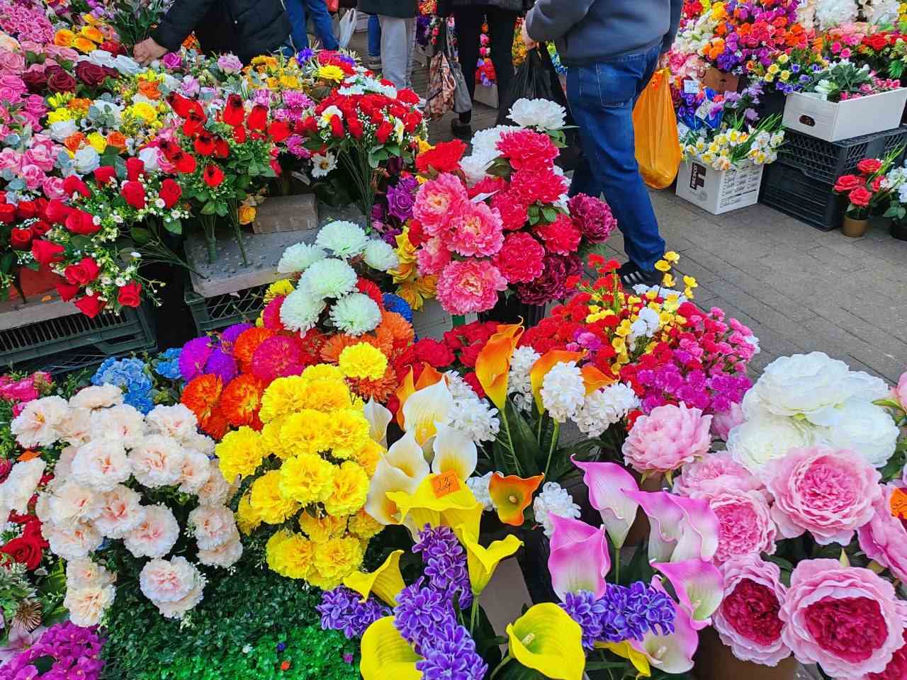 Ассортимент поражает разнообразием. На прилавках представлены как одиночные цветы — розы, лилии, гвоздики, хризантемы, тюльпаны, ромашки, так и полноценные композиции в корзинах и вазонах. Особенно популярны готовые наборы в пастельных и бело-красных оттенках, которые символизируют чистоту и память.
