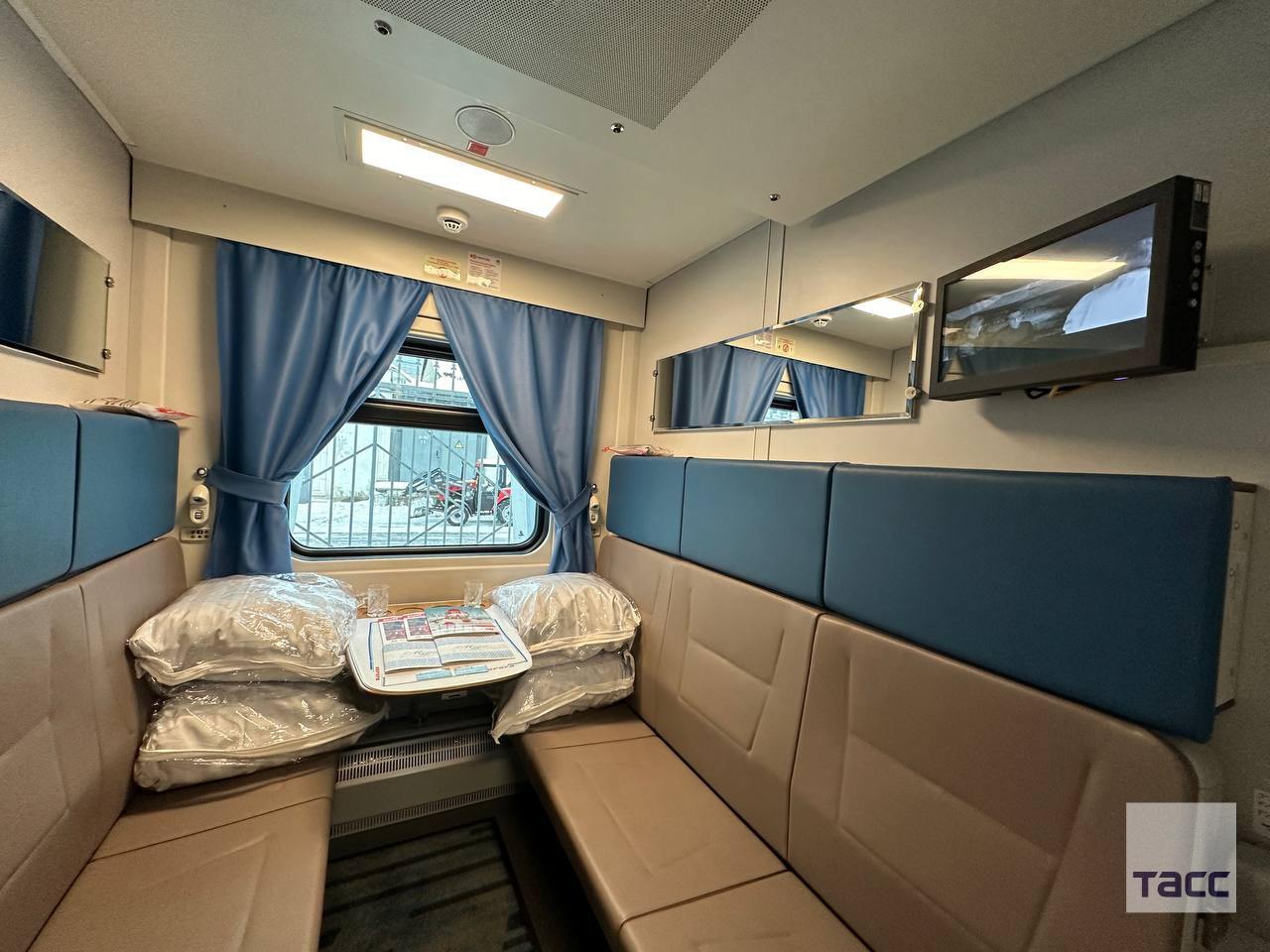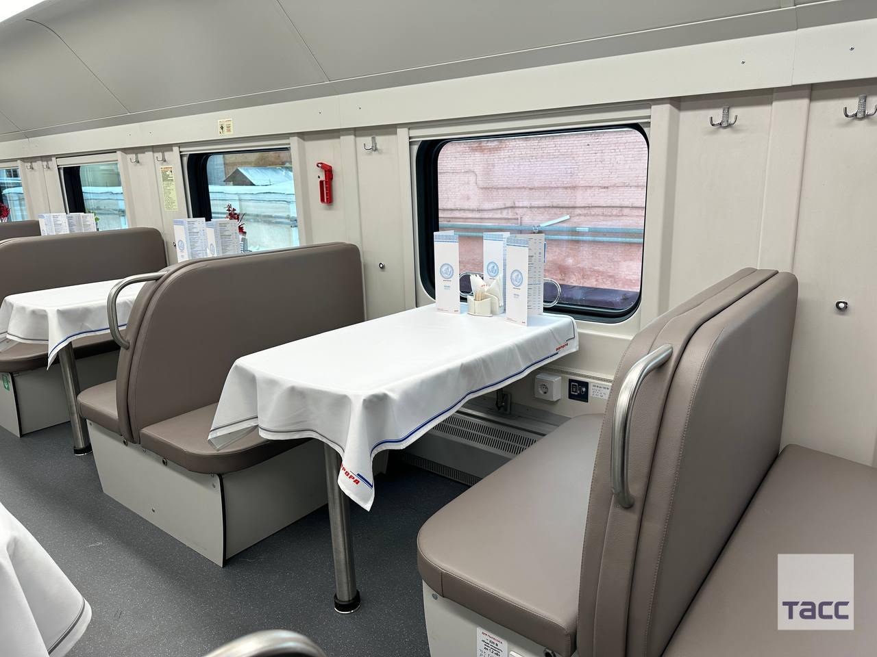 Новый экспресс включает в себя до 15 двухэтажных вагонов и сможет вместить до 1200 пассажиров за раз. Поездка в новом поезде станет для пассажиров увлекательным и приятным путешествием, потому что в обновлённом подвижном составе железнодорожники предусмотрели для них максимум комфорта.