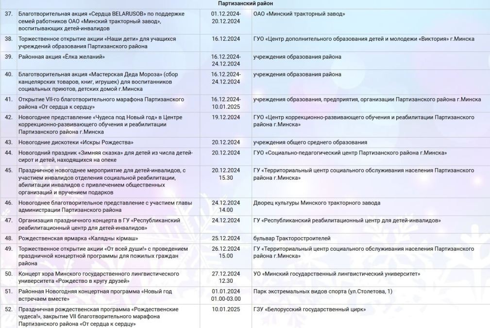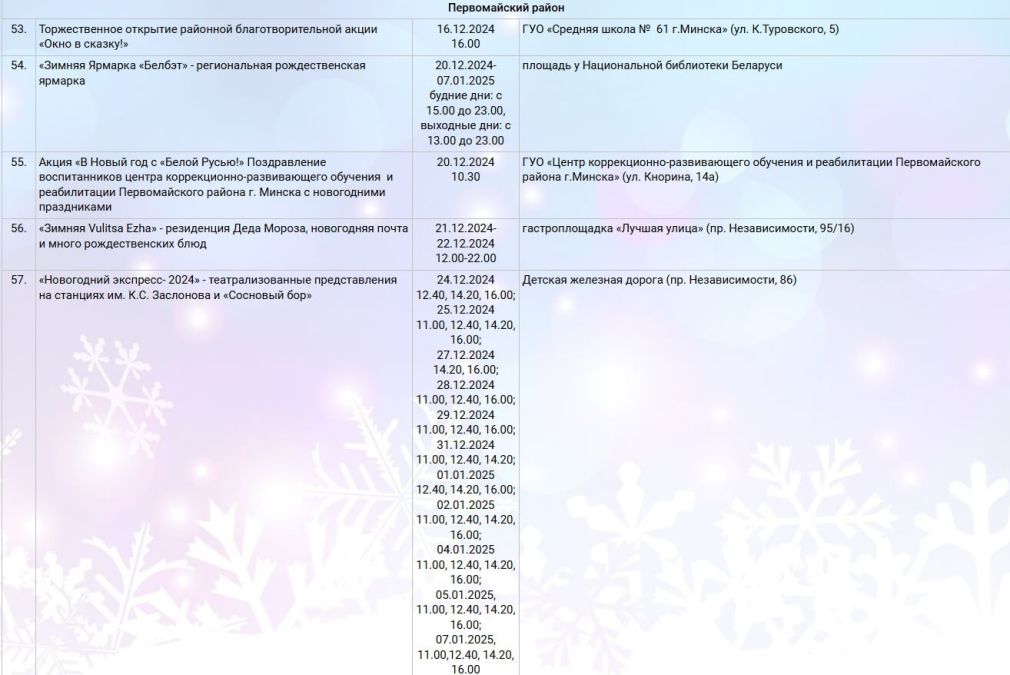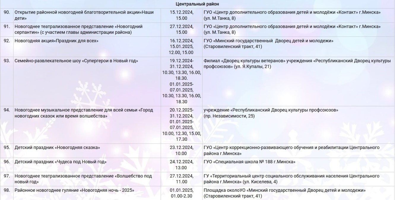 Отдельно отметим и новогодние мероприятия во всех районах Минска, благодаря которым все, кому лень будет ехать на центральные празднества, смогут окунуться в новогоднюю атмосферу и поводить хороводы вокруг елки.