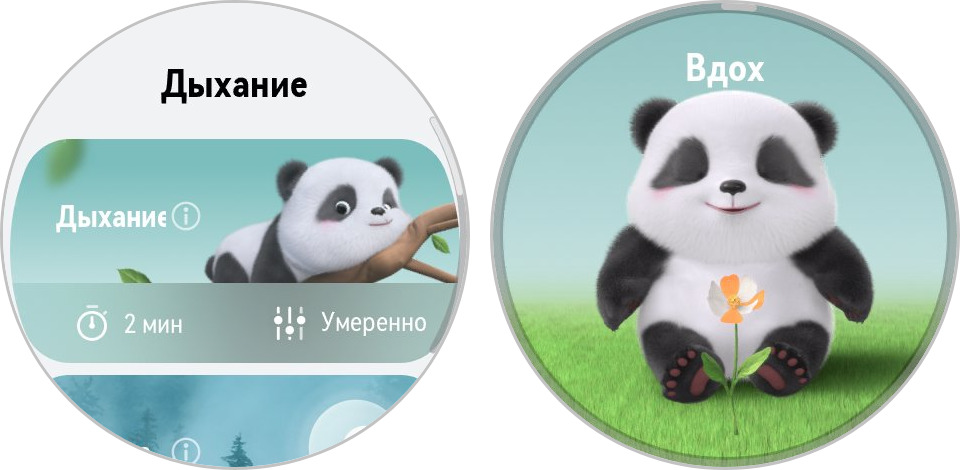 Часы следят не только за физической формой, но и за ментальным здоровьем. Функция «Эмоции» распознает 12 эмоциональных состояний и предлагает помощь. Например, после сложного рабочего дня часы могут заметить эмоциональное напряжение и предложить дыхательное упражнение. Особенно мило выглядит режим дыхания с пандой: на экране появляется симпатичный анимированный персонаж, который помогает делать процесс расслабления более наглядным и приятным.