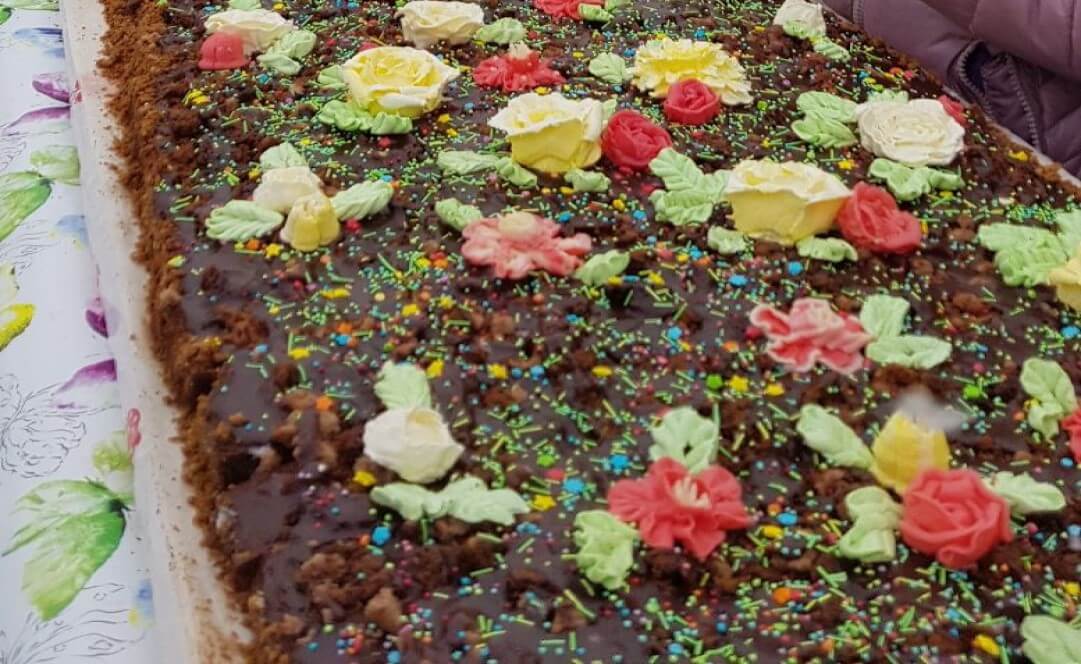 Пирог получился длиной 4 метра 25 сантиметров и 55 сантиметров шириной, который залили десятью литрами шоколадной заливки. Вместе с чаем из русского самовара на углях он ждал всех желающих по окончании праздничной литургии на улице.