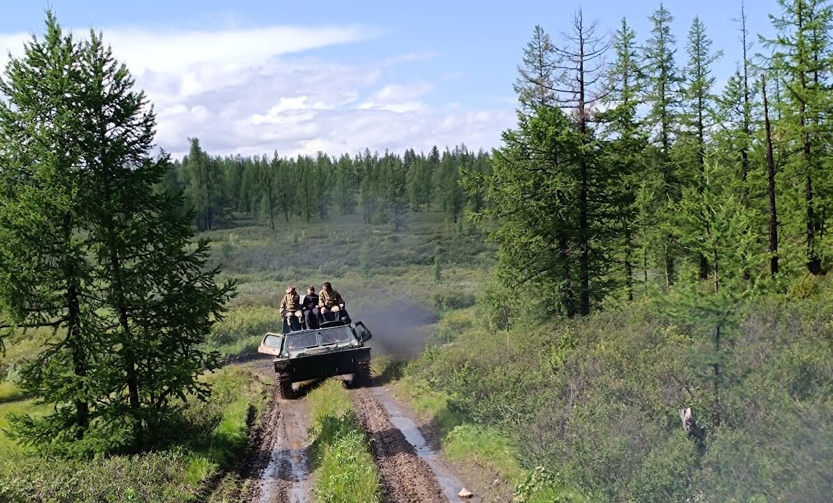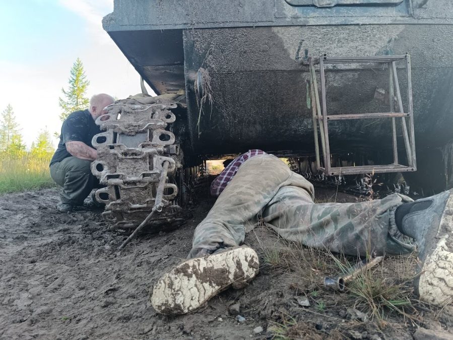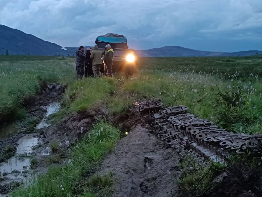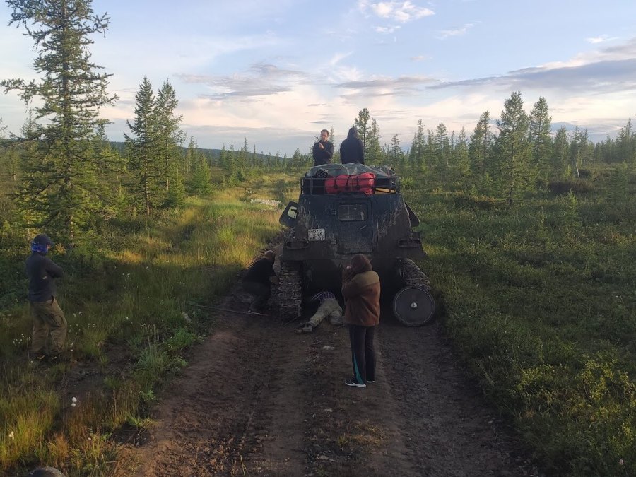 Сидя на крыше, я чувствовал себя подростком, которого посадили первый раз прокатиться на повозке с лошадью. Я наслаждался видами, красотами и далями этого прекрасного края. Когда на одном из вездеходов полностью слетела гусеница, наша команда поближе познакомилась с местной фауной. Комары, мошки, гнусы так и норовят попробовать тебя на вкус. Вооружившись баллончиками от насекомых и накомарниками, мы с интересом наблюдали за ремонтом гусеницы вездехода. Чтобы нашему водителю было проще, его напарник решил вытащить его из ямы, а затем продолжить ремонт.