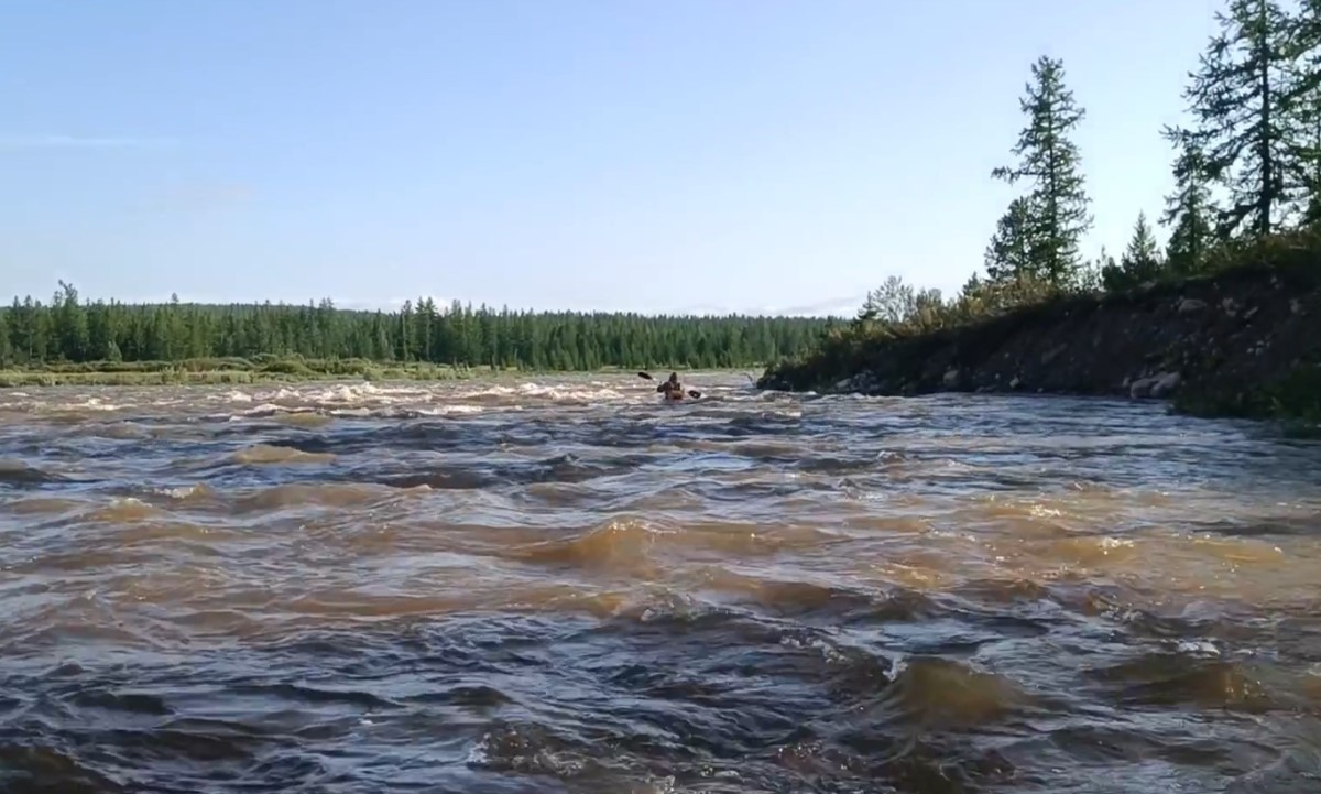 Далее нас ждала 10 дневная водная часть - сплав на 2 катамаранах, двухместной байдарке и одноместном надувном каяке. Сергей, самый опытный водник, часто шел на своем каяке впереди группы и сигнализировал как катамаранам лучше проходить шиверы, чтобы не сесть на мель.