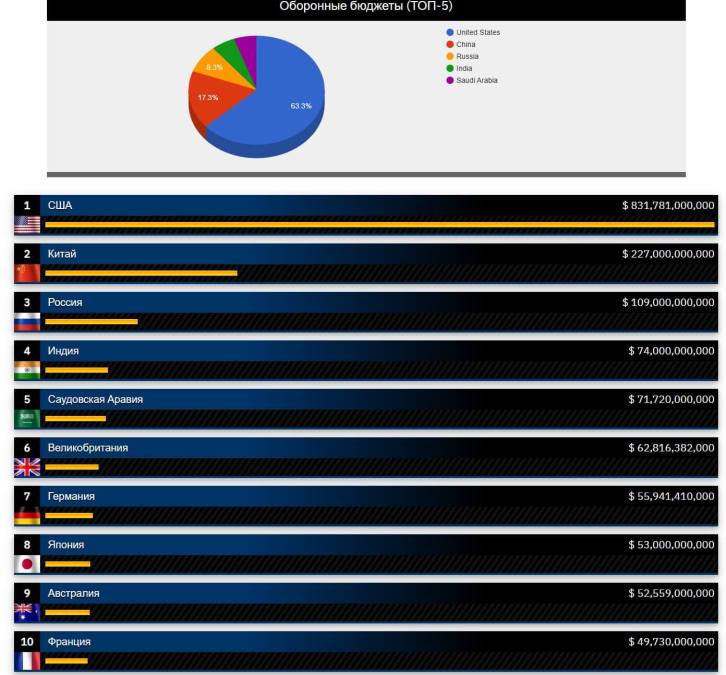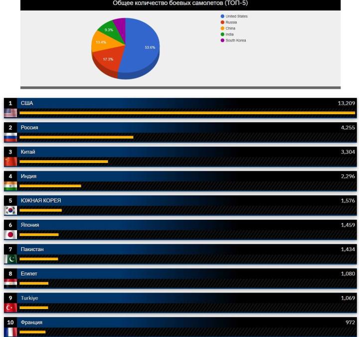 Если говорить об отдельных рейтингах, то здесь можно отметить доминирование США лишь в двух из них - расходах на оборону и количестве боевых самолетов. Так, Соединенные Штаты имеют оборонный бюджет в размере 831,8 млрд долларов, в то время как Китай и Россия - 227 и 109 млрд долларов соответственно. Существенный перевес у Штатов и в части боевых самолетов - 13209 штук, против 4255 и 3304 штук - у России и Китая.