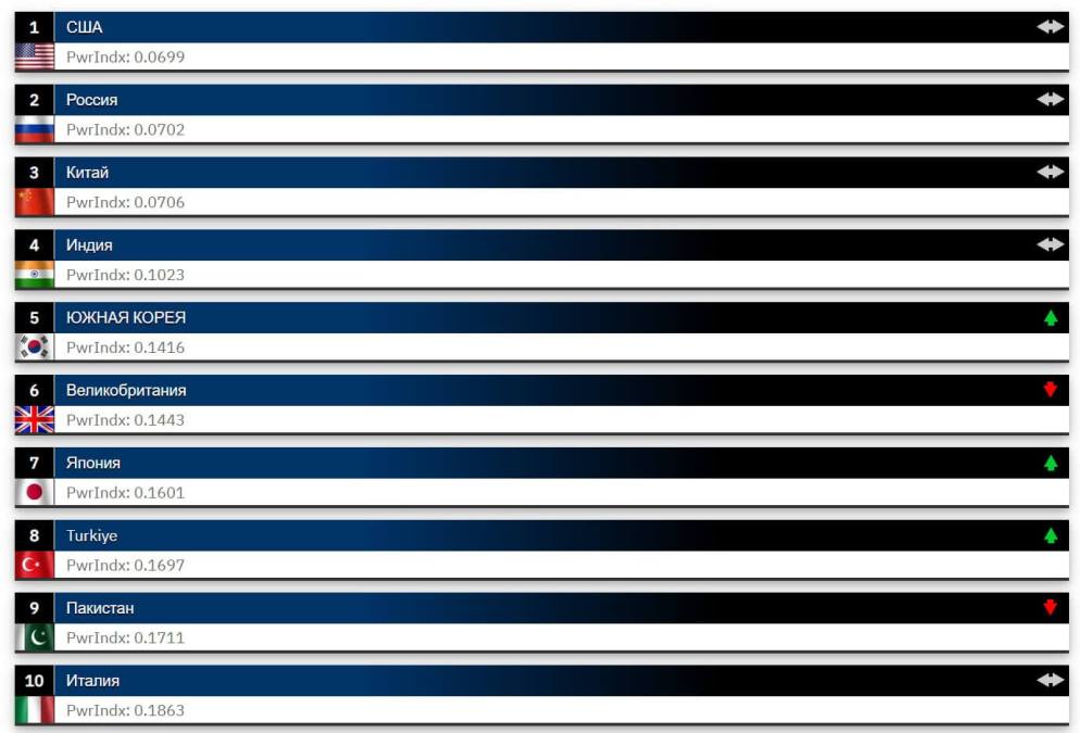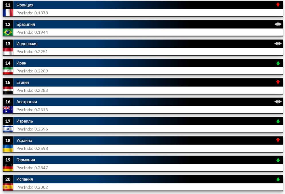Интересно отметить, что в ТОП 10 не вошли ни Франция (у нее 11-я строчка с рейтингом 0,1878), ни Германия, которая занимает 19-ю строчку списка с PwrIndx, равным 0,2847.